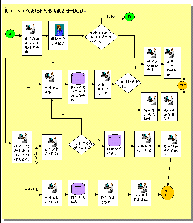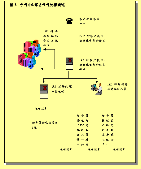 圖3概述了呼叫中心服務呼叫處理過程。描述了進入呼叫中心系統(tǒng)的各種呼叫如何完成處理過程,或者由真人代表完成,或者是通過IVR技術完成。