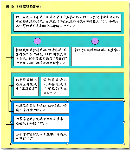 根據呼叫處理部分所作的說明,在完成初次聯(lián)絡過程之后,服務代表將確定呼叫者的需要。之后服務代表將協(xié)助呼叫者或者使其選擇IVR系統(tǒng),該系統(tǒng)通過自動為這些請求錄音提供相關的信息和服務。服務代表將接受培訓識別哪些交易服務和信息服務可以通過IVR進行,這樣他們可以使呼叫者選擇自我服務。圖9圖示了用這一辦法處理呼叫的過程。