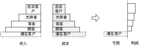 科特勒根據(jù)客戶的忠誠(chéng)度給了我們一個(gè)階梯,這是客戶關(guān)系管理工作的良好參照,同時(shí)也可作為客戶關(guān)系管理工作考核的工具。我們將這個(gè)階梯做如下改造:每個(gè)層次的寬度是此級(jí)次客戶的數(shù)量,每個(gè)層次的高度是此級(jí)次客戶給企業(yè)帶來(lái)的收入,我們可以得到一個(gè)企業(yè)收入客戶分布結(jié)構(gòu)圖,如右圖所示: 從圖中可以很清楚的看出客戶管理工作的內(nèi)容:層次寬度(每個(gè)層次客戶的數(shù)量)和層次的高度(每個(gè)層次客戶的平均贏利水平)。 |
