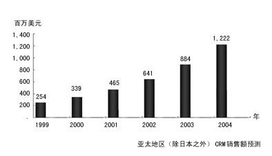 亞太地區(qū)正在成為CRM應(yīng)用軟件的新興市場。1999年亞太地區(qū)CRM市場的年增長率達(dá)33.5%。其中中國CRM市場是除日本外最具發(fā)展?jié)摿Φ氖袌。預(yù)計(jì)到2004年,中國CRM市場的復(fù)合年平均增長率為60%。