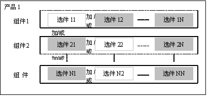 產(chǎn)品是由多個組件組成的,而組件則由多個選件組成。組件可以是有形的(如電腦硬盤)也可以是無形的(如保修期),產(chǎn)品,組件與選件的關(guān)系可以由圖6、2、2來說明。