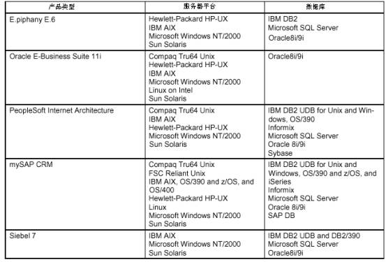 環(huán)境是企業(yè)在選擇軟件的過程中最簡單的技術(shù)架構(gòu)的評估標準,而且是最容易區(qū)分的。最重要的環(huán)境就是CRM產(chǎn)品所支持的服務器平臺和數(shù)據(jù)庫。在你選擇CRM產(chǎn)品時,最好不要改變你現(xiàn)有的服務器平臺和數(shù)據(jù)庫標準,否則你將會增加很多投資。因此一個CRM產(chǎn)品最好要支持你的企業(yè)原有環(huán)境。下表列出了那5家產(chǎn)品的技術(shù)架構(gòu)的環(huán)境。