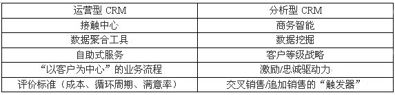 一般情況下CRM的可分為兩大類:即運(yùn)營(yíng)型CRM和分析型CRM。(有時(shí)把"協(xié)作型CRM"單獨(dú)作為一類)。多數(shù)情況之下運(yùn)營(yíng)型CRM引用的是產(chǎn)品,服務(wù)和一個(gè)企業(yè)實(shí)際能夠"照料"客戶的運(yùn)做能力。關(guān)系中心,數(shù)據(jù)集合系統(tǒng)及Web站點(diǎn)僅僅是一些例子。分析型CRM主要指用來(lái)推動(dòng)"以客戶為中心"的戰(zhàn)略和工具。商務(wù)智能系統(tǒng),數(shù)據(jù)挖掘工具及客戶層級(jí)戰(zhàn)略都可以算在這個(gè)范疇之內(nèi)。