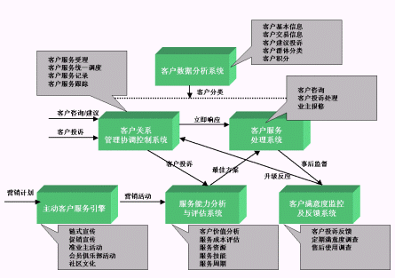 目的是保證和提高客戶服務(wù)的工作效率與質(zhì)量水平。例如,當(dāng)客戶滿意度監(jiān)測與反饋系統(tǒng)將客戶信息反饋給協(xié)調(diào)控制系統(tǒng)后,后者立刻要求客戶盈利能力評估系統(tǒng)進(jìn)行評估,并提出最佳方案,然后向客戶服務(wù)處理系統(tǒng)發(fā)出指令,由它進(jìn)行實(shí)施。