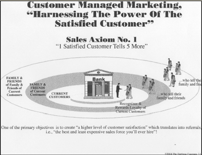 客戶滿意的影響范圍如下圖所示,客戶滿意的力量從里向外逐層波及,以現(xiàn)有客戶的滿意為基礎(chǔ),然后通過(guò)推薦傳遞到新的客戶。其傳遞路徑為“現(xiàn)有客戶”——“現(xiàn)有客戶的家人及朋友”——“現(xiàn)有客戶的家人及朋友的家人及朋友”…一直延伸下去最終使企業(yè)的營(yíng)銷策略大獲成功,這一切的動(dòng)力都來(lái)自于“更高的客戶滿意度引起的客戶行為”。這個(gè)營(yíng)銷公式要取得長(zhǎng)期成功沒(méi)有任何秘密,它失敗的風(fēng)險(xiǎn)被最小化,因?yàn)樗揽康氖强蛻舴e極的行動(dòng)和表現(xiàn),以久經(jīng)考驗(yàn)的銷售公理——“1個(gè)滿意的客戶會(huì)把自己的愉快經(jīng)歷告訴5個(gè)以上的人!薄獮榛A(chǔ)。