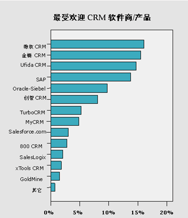 而在此類調(diào)查中一直名列前茅的國外CRM軟件商三巨頭SAP和 Oracle-Siebel(由于Siebel已被Oracle兼并,現(xiàn)以O(shè)racle-Siebel代替),在本次知名度調(diào)查中則落后于以上三家CRM軟件商。SAP和Oracle-Siebel的這一比例分別為13.80%和9.74%。