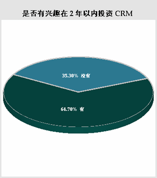 在選擇“尚未使用任一CRM軟件”的被調(diào)查者中,當(dāng)被問及基于現(xiàn)在的狀況,“是否有興趣在兩年以內(nèi)投資CRM”。有64.70%的被調(diào)查者選擇有興趣在兩年內(nèi)投資CRM軟件,而選擇沒有興趣在兩年內(nèi)投資CRM軟件的只占35.30%。盡管現(xiàn)在實(shí)際使用CRM軟件的用戶所占比例還不甚理想,但市場前景還是非?春,大部分公司具有實(shí)施CRM軟件的需求。