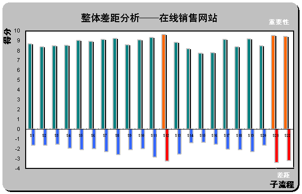 (2)整體差距分析(Gap Analysis)。請見上圖X軸下方所示,計(jì)算所有被調(diào)查對所列在線銷售網(wǎng)站的滿意度平均值(綜合最喜歡在線銷售網(wǎng)站和最不喜歡在線銷售網(wǎng)站的滿意度,計(jì)算被調(diào)查者對22個(gè)子流程的滿意度評分)。通過計(jì)算重要性和滿意度的差距,首先,一個(gè)有趣的現(xiàn)象,在著色的三個(gè)差距最大的子流程剛好也是重要性得分排名前三位的流程S12,