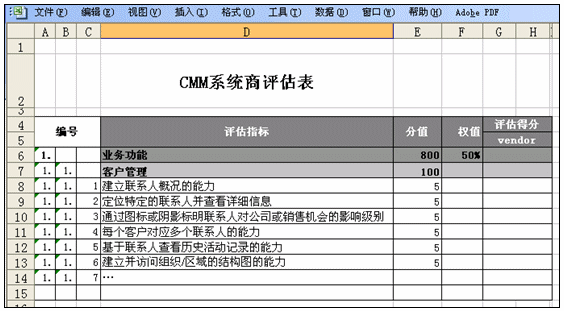CMM體系中的標準并非在每一次評估中都需要用的,它實際上是一個滿足大部分CRM評估的標準的合集。所以應用者首先要自己或者借助評估顧問來選擇CMM指標范圍,確定哪些指標參與此次評估。