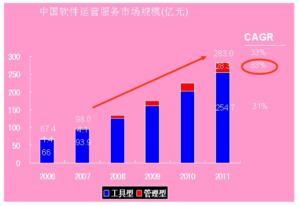 2006中國軟件運營服務(SaaS)產(chǎn)業(yè)的規(guī)模為68億元,2011年將突破400億,達到406億元,未來五年的復合增長率達到43%。這是國內ICT領域權威研究機構計世資訊(CCW Research)在其最新發(fā)布的《軟件業(yè)的下一個十年——中國軟件運營服務(SaaS)市場發(fā)展趨勢研究報告》中指出的。