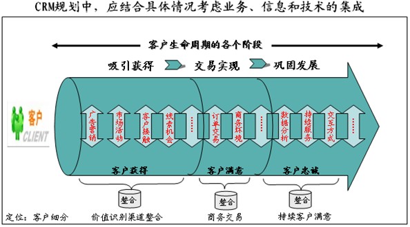 在客戶生命周期的全過程中,企業(yè)通過高效、有序的管理手段和信息技術(shù),識(shí)別、吸引獲得、交易實(shí)現(xiàn)、鞏固發(fā)展客戶,與其保持終身的互動(dòng)關(guān)系,并有計(jì)劃地滿足其需求。整個(gè)過程中有一橫N縱,一橫就是客戶生命周期線,N縱就是企業(yè)與客戶生命周期線的每個(gè)直接或間接接觸點(diǎn)。通過這一橫N縱,打造以客戶為中心的360度客戶服務(wù)。有的接觸點(diǎn)貫穿客戶整個(gè)生命周期。