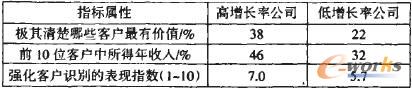 對《財(cái)富》雜志排名前l(fā)000位公司的200位經(jīng)理調(diào)查后得出結(jié)論,企業(yè)增長性與清楚的識(shí)別客戶有明顯的聯(lián)系(見表1)。該表反映了高增長率的企業(yè)比低增長率的企業(yè)更加懂得客戶識(shí)別的重要性,并運(yùn)用技巧來強(qiáng)化核心客戶為企業(yè)創(chuàng)造更多價(jià)值。