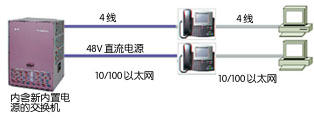 第三種方式,是擴(kuò)充局域網(wǎng)交換機的功能,在局域網(wǎng)交換機的接口模塊上增加特殊部件,實現(xiàn)內(nèi)置供電功能(Inline Power)。如下圖: