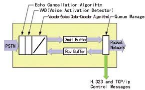 網(wǎng)關(guān)(Gate Way) 網(wǎng)關(guān)是在PSTN和分組交換網(wǎng)之間傳輸呼叫的器件,包括語音編碼器、回音抑制器、靜音抑制、收/發(fā)緩存器和分組交換網(wǎng)的排序管理等部分,如圖2所示。