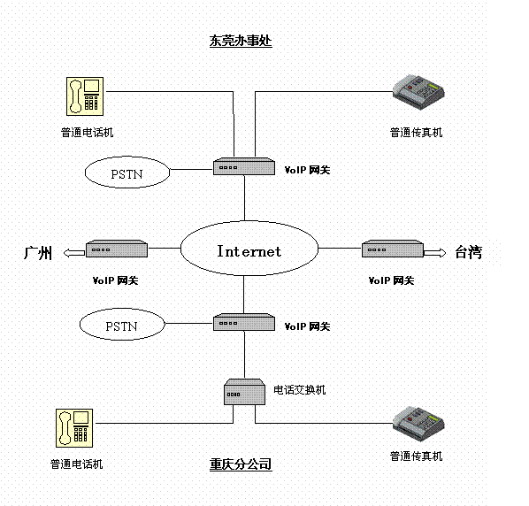 有一家臺商公司,在臺灣、東莞、廣州和重慶自己的分支機構,相互之間有大量的通話聯(lián)系,特別是研發(fā)部門,其通話量更是非常大。因此試圖在各個地方之間使用IP電話來降低通訊支出。在實施IP電話服務之前,各個地方都擁有完善的局域網,并且申請了固定IP的寬帶接入。并且在辦公室內部署了程控電話交換機。