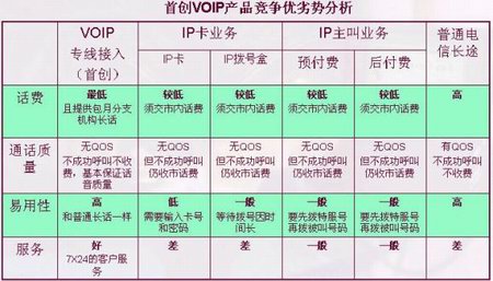 比業(yè)內(nèi)其他多種IP電話更具價格優(yōu)勢。每個長途呼叫無論是否建立成功,都不收取本地市話費(fèi)用。對于國內(nèi)目前話務(wù)量集中的國際間通信,采用的資費(fèi)標(biāo)準(zhǔn)相對其他運(yùn)營商具有價格優(yōu)勢。對于企業(yè)的Intranet Call,由于企業(yè)間不產(chǎn)生話費(fèi),更能夠節(jié)省大量的話務(wù)開支。