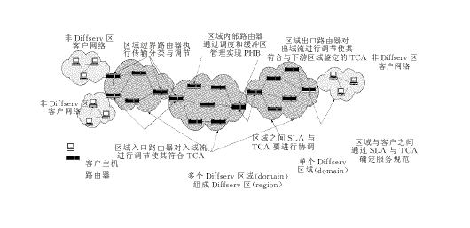 區(qū)分服務是由綜合服務(Int-serv )發(fā)展而來的,它采用了IETF的基于RSVP的服務分類標準,拋棄了分組流沿路節(jié)點上的資源預留。區(qū)分服務將會有效地取代跨越大范圍的RSVP的使用。區(qū)分服務區(qū)域的主要成員有:核心路由器、邊緣路由器、資源控制器(BB,Bandwidth Broker)。在區(qū)分服務中,網(wǎng)絡的邊緣設備對每個分組進行分類、標記DS域,用DS域來攜帶IP分組對服務的需求信息。在網(wǎng)絡的核心節(jié)點上,路由器根據(jù)分組頭上的DS碼點(Code Point)選擇碼點所對應的轉(zhuǎn)發(fā)處理。資源控制器BB配置了管理規(guī)則,為客戶分配資源,它可以通過服務級別協(xié)定SLA (Service Level Agreement)與客戶進行相互協(xié)調(diào)以分享規(guī)定的帶寬。