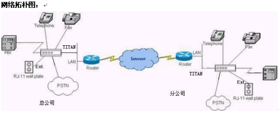 在公司長(zhǎng)途話務(wù)量最集中(當(dāng)然也是話費(fèi)最高)的兩端(或數(shù)端),分別安裝一臺(tái)我公司研制生產(chǎn)的TITAN VOIP語(yǔ)音設(shè)備,并通過ADSL、Cable Modem或者數(shù)據(jù)專線將它們互聯(lián)起來(lái),將可以使您現(xiàn)有大范圍分散于各處的PBX,以最低的運(yùn)作成本(長(zhǎng)途話費(fèi)為零),連接到一起,猶如整個(gè)公司在使用一個(gè)巨大的PBX系統(tǒng)。你可以只拔打一個(gè)號(hào)碼就進(jìn)入另一個(gè)遠(yuǎn)端PBX系統(tǒng),將現(xiàn)有的資源運(yùn)用至極限。