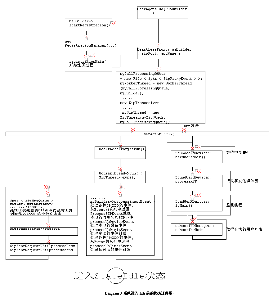構(gòu)建User Agent的工作已經(jīng)完畢,現(xiàn)在應(yīng)該讓調(diào)用它的Run方法了;從下面的程序可以看到,Run方法的調(diào)用,讓整個(gè)程序進(jìn)入一種"Idle"的狀態(tài),等待命令輸入和狀態(tài)的產(chǎn)生,這個(gè)過程我們可以看到在Ua.CXX的Main程序中調(diào)用(ua.run())。