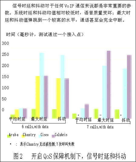 而當(dāng)我們通過(guò)一個(gè)接入點(diǎn)或交換機(jī)傳送6到7個(gè)并行VoIP呼叫時(shí),尤其是加入了數(shù)據(jù)通信業(yè)務(wù)后,所有產(chǎn)品的系統(tǒng)性能顯著降低。另外,當(dāng)開(kāi)通7個(gè)并行VoIP呼叫和關(guān)閉QoS保障機(jī)制時(shí),即使沒(méi)有加入數(shù)據(jù)業(yè)務(wù), Colubris設(shè)備也幾乎都處于通話中斷的狀態(tài)。因此,我們無(wú)法得到任何測(cè)試數(shù)據(jù)(如圖1所示)。