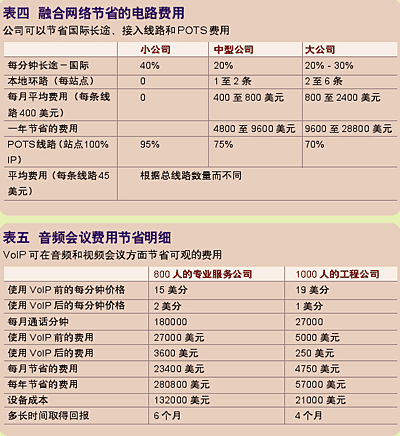 據(jù)研究顯示,當公司融合它們的網(wǎng)絡后,將電信費用減少了25%到60%。(見表四)這筆費用包括每分鐘長途、本地環(huán)路、普通電話服務(POTS)線路和音頻/視頻服務。