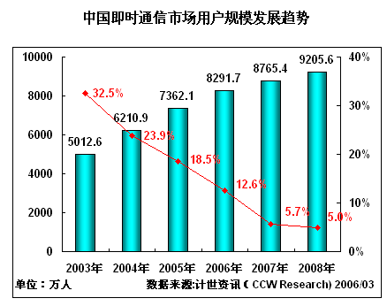 即時通訊巨大的市場價值主要來自三方面,除了能夠增加門戶網(wǎng)站的用戶的黏性,即時通訊能夠帶來巨大的用戶和網(wǎng)絡(luò)通訊巨大的市場。根據(jù)計世資訊《2005-2006年中國VoIP業(yè)務(wù)發(fā)展趨勢研究報告》相關(guān)數(shù)據(jù)顯示,2005年中國即時通訊用戶達(dá)到7362.1萬人,增長率為18.5%,2005年中國即時通訊市場規(guī)模達(dá)到16.2億元,實現(xiàn)37.3%的增長率。