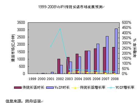 2008年大部分本地長話和幾乎全部國際長話業(yè)務(wù)中VoIP將占據(jù)統(tǒng)治地位,傳統(tǒng)電路交換方式長話電話的份額將進(jìn)一步萎縮到10%以下。