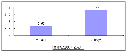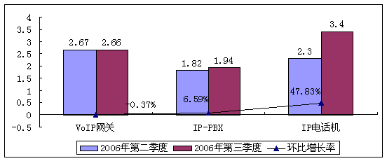 2006年國(guó)內(nèi)傳統(tǒng)電信運(yùn)營(yíng)商已經(jīng)逐步開始進(jìn)入到NGN及新一代VoIP業(yè)務(wù)的實(shí)質(zhì)性網(wǎng)絡(luò)建設(shè)階段,并且隨著企業(yè)對(duì)VoIP理解的加深及控制成本的考慮,大型企業(yè)CIO對(duì)VoIP的接納態(tài)度正在向好。在中小型企業(yè)市場(chǎng),由于企業(yè)對(duì)通信成本更加敏感,但受VoIP設(shè)備技術(shù)成熟及價(jià)格下降這些因素的影響,這一市場(chǎng)也在迅速升溫。這些都促使VoIP設(shè)備在2006年開始進(jìn)入實(shí)際購(gòu)買階段,促進(jìn)了VoIP設(shè)備規(guī)模增長(zhǎng)。2006年第二季度國(guó)內(nèi)VoIP設(shè)備市場(chǎng)收入為6.79 億人民幣,與第一季度同比增長(zhǎng)率為19.96%,整體市場(chǎng)保持穩(wěn)定增長(zhǎng)。從中國(guó)VoIP設(shè)備產(chǎn)品市場(chǎng)結(jié)構(gòu)(銷售額劃分)來(lái)看,VoIP網(wǎng)關(guān)占39.2%,IP-PBX占26.9%,IP電話機(jī)占33.9%。