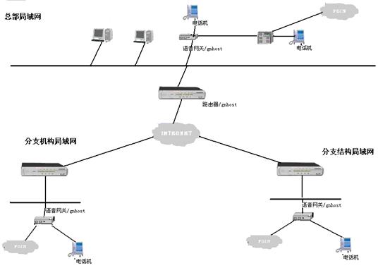 首先將VOIP電話網(wǎng)關(guān)的網(wǎng)絡(luò)接口接入到公司和分部(分公司)的局域網(wǎng)中,通過ADSL、ISDN、撥號上網(wǎng)等方式,同連接在此因特網(wǎng)上的其它VOIP電話網(wǎng)關(guān)相連,從而將不同地域的電話連接在一起,組成整個(gè)公司的IP電話網(wǎng),如果總部或分部有用戶程控交換機(jī),還可以將VOIP電話網(wǎng)關(guān)接入程控交換機(jī),使得整個(gè)交換機(jī)的分機(jī)都能利用IP網(wǎng)絡(luò)撥打免費(fèi)電話。如果這個(gè)VOIP設(shè)備具有PBX的功能。那么電話網(wǎng)關(guān)的多種接口還可以與電信(PSTN)相連,從而將專網(wǎng)的IP電話語音網(wǎng)與整個(gè)公網(wǎng)銜接成一個(gè)大的電話網(wǎng)絡(luò)。