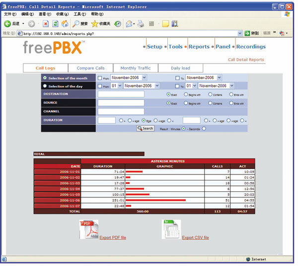 使用Trixbox的統(tǒng)計(jì)報(bào)告功能(如圖5所示),用戶能夠察看在一個(gè)時(shí)間段內(nèi)的通話統(tǒng)計(jì)數(shù)據(jù),例如呼叫建立總數(shù)、呼叫平均時(shí)長(zhǎng)、失敗呼叫比例等等,當(dāng)然也能夠察看每個(gè)呼叫的主叫/被叫號(hào)碼,以及呼叫發(fā)生的具體時(shí)間。