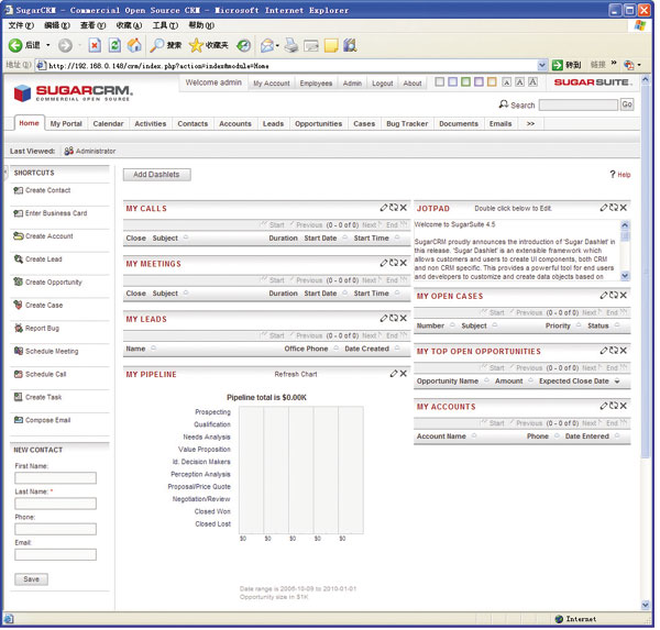 SugarCRM的默認(rèn)界面提供了個(gè)人門戶、日歷、事件、聯(lián)系人、機(jī)會(huì)管理、項(xiàng)目、問題追蹤、文檔等常用模塊,用戶還可以根據(jù)自己的需要增加新的模塊。當(dāng)前,SugarCRM已經(jīng)能夠較好地支持簡(jiǎn)體中文,即使在英文界面中,也可以顯示和編輯中文字符,但在基于中文的排序方面尚未實(shí)現(xiàn)。另外,雖然SugarCRM提供了簡(jiǎn)體中文語(yǔ)言包,但是只支持UTF-8編碼,在我們實(shí)測(cè)中發(fā)現(xiàn)會(huì)有亂碼問題,因此建議用戶還是選擇在英文界面中處理簡(jiǎn)體中文。