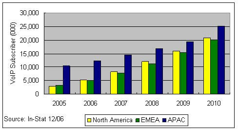 應該說在2006年,VoIP技術已經(jīng)不是阻礙其市場發(fā)展的主要因素,因為In-Stat在全球個人VoIP消費市場中作的調查顯示,約9%的VoIP用戶甚至不清楚自己在使用IP傳輸;有64%的用戶在使用免費的VoIP服務。其次有超過73%的用戶并不把是否使用IP技術當成選擇該業(yè)務的影響因素。而寬帶接入市場的競爭則構成了VoIP發(fā)展的關鍵因素,作為一種寬帶應用,誰的接入資源占據(jù)了用戶家庭,誰就可以決定是否采用VoIP技術來提供語音業(yè)務。在歐洲法國Free Telecom與意大利的FastWeb都是三重播放業(yè)務的積極推進者,在VoIP市場居領先地位;在日本Yahoo!BB擁有亞洲地區(qū)50%的寬帶VoIP用戶。幾乎所有這些寬帶ISP提供商往往采用包月的形式或者以極低的費用提供無限制的本地或國內通話,在國際長途電話上提供極大的折扣。