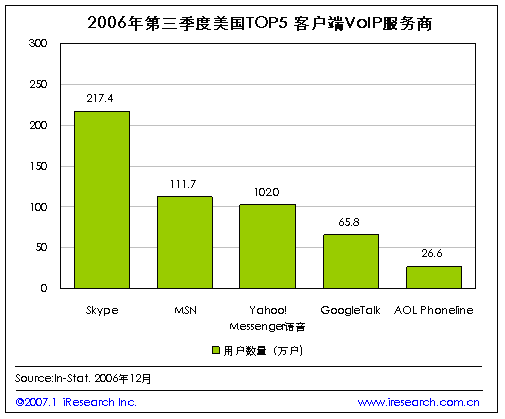 iResearch艾瑞市場(chǎng)咨詢根據(jù)In-Stat的統(tǒng)計(jì)數(shù)字整理發(fā)現(xiàn),目前在美國(guó)VoIP市場(chǎng)中,以客戶端為服務(wù)基礎(chǔ)的服務(wù)提供商的用戶數(shù)量來看,占市場(chǎng)主導(dǎo)位置的五大服務(wù)商為Skype、MSN、Yahoo、Google和AOL.到2006年第三季度為止,Skype的用戶已經(jīng)達(dá)到了217.4萬(wàn),排名第五位AOL Phoneline的用戶數(shù)量也有26.6萬(wàn)之多。