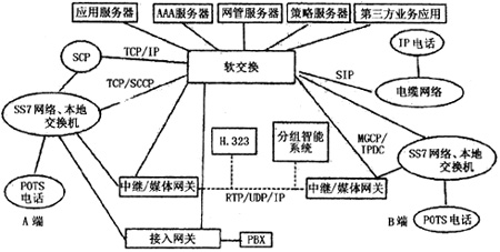 軟交換技術通過SIP協(xié)議接到電纜網(wǎng)絡上,以支持企業(yè)的IPPBX及IP電話。并通過TCP/IP協(xié)議接入SCP,也可通過TCP/SCCP協(xié)議接入到SS7網(wǎng)絡上,使與PSTN及當前的VoIP網(wǎng)絡無縫互連成為可能。
