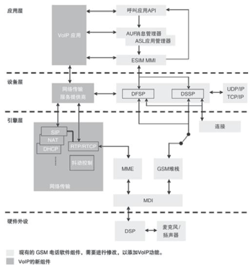 藍色方塊表示現(xiàn)有平臺的新應用,包括網(wǎng)絡傳輸協(xié)議、核心控制VoIP應用。由于支持GPRS功能的每部移動電話都應該帶有TCP/UDP