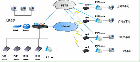 在企業(yè)總部部署一臺OfficeTen,利用OfficeTen的軟交換功能實(shí)現(xiàn)企業(yè)內(nèi)部IP網(wǎng)絡(luò)放號、IP Phone的注冊管理和寬帶網(wǎng)絡(luò)的接入,并可實(shí)現(xiàn)總部分機(jī)同時(shí)具有外線號碼功能。OfficeTen通過多路FXO口接入PSTN網(wǎng)絡(luò),通過Ethernet口接入Internet,實(shí)現(xiàn)語音和數(shù)據(jù)的綜合接入;對內(nèi)通過Ethernet口連接內(nèi)部Router和Switch,通過FXS口接入模擬PSTN