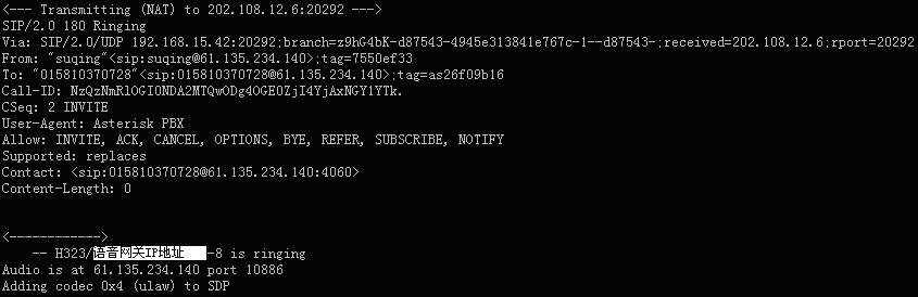 表示軟交換Asterisk與華為8010語(yǔ)音網(wǎng)關(guān)的H323連接已經(jīng)成功建立