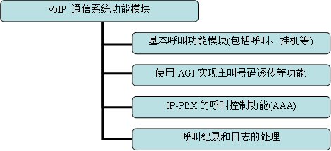 如果是基于純軟件的實(shí)現(xiàn)方案,Asterisk是構(gòu)建VoIP項(xiàng)目的核心,系統(tǒng)中所有與用戶呼叫有關(guān)的功能和管理都通過(guò)它來(lái)實(shí)現(xiàn),包括VoIP各種協(xié)議的互通和配置,以及各種呼叫設(shè)備的配置文件。本文檔所討論的VoIP通信系統(tǒng)基本功能如圖3-2所示,一般的Asterisk的任務(wù)包括了兩方面,一是與呼叫有關(guān)的,包括基本呼叫處理、主叫號(hào)碼透?jìng)、呼叫紀(jì)錄和日志生成等,二是與呼叫控制有關(guān),即終端用戶的認(rèn)證計(jì)費(fèi)功能。