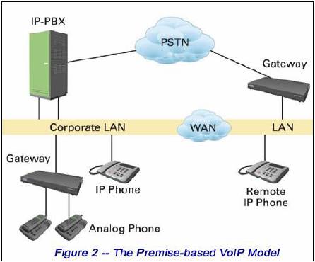 與托管VoIP模式相比,基于內(nèi)建的模式在中小型企業(yè)設(shè)施中設(shè)有IP PBX (圖2)。在此架構(gòu)下,供應(yīng)商一般會(huì)提供捆綁業(yè)務(wù),包括基于因特網(wǎng)接入的