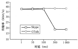 kbit/s降為19.36 kbit/s。然而,對(duì)于GTalk其傳輸率則沒(méi)有明顯變化。由圖6可知,在時(shí)延為1 ms、10