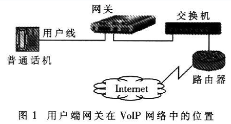 近年來隨著寬帶網(wǎng)絡(luò)和IP技術(shù)的日益發(fā)展,VoIP>(Volee over Internet Protoc01)技術(shù)的應(yīng)用越來越廣泛。網(wǎng)關(guān)是VoIP網(wǎng)絡(luò)中的重要設(shè)備,按照應(yīng)用領(lǐng)域可分為電信級(jí)網(wǎng)關(guān)和用戶端網(wǎng)關(guān)。用戶端網(wǎng)關(guān)設(shè)備主要應(yīng)用于小區(qū)和企業(yè),是連接終端電話和IP網(wǎng)絡(luò)的橋梁,主要功能是進(jìn)行語音編解碼、信令處理、VoIP協(xié)議處理和路由協(xié)議處理等。用戶端網(wǎng)關(guān)設(shè)備在VoIP網(wǎng)絡(luò)中的位置如圖1所示?梢钥闯觯W(wǎng)關(guān)處于用戶電話線路部分的末端、IP網(wǎng)絡(luò)部分的起始端。