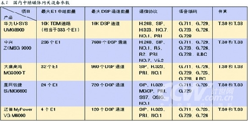 結(jié)合表2中的數(shù)據(jù),可以看出國(guó)內(nèi)中繼媒體網(wǎng)關(guān)設(shè)備制造商的定位非常類似于軟交換設(shè)備的市場(chǎng)定位,從設(shè)備支持的最大E1數(shù)和最大DSP通道數(shù)來(lái)看,華為和中興的中繼媒體網(wǎng)關(guān)主要是面向運(yùn)營(yíng)商客戶,不難發(fā)現(xiàn)網(wǎng)關(guān)支持的協(xié)議也最為豐富,能夠滿足和運(yùn)營(yíng)商不同協(xié)議體系網(wǎng)絡(luò)互通的需要。而大唐高鴻、星網(wǎng)銳捷和邁普的中繼媒體網(wǎng)關(guān)主要定位在企業(yè)行業(yè)客戶。
