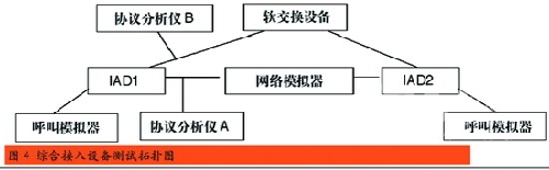 我國(guó)通信行業(yè)國(guó)家標(biāo)準(zhǔn)《基于軟交換的綜合接入設(shè)備測(cè)試方法》中明確了IAD設(shè)備九個(gè)大項(xiàng)的測(cè)試,分別是基本功能測(cè)試、協(xié)議測(cè)試、接口測(cè)試、話音業(yè)務(wù)測(cè)試、數(shù)據(jù)業(yè)務(wù)測(cè)試、性能測(cè)試、OAM測(cè)試、硬件項(xiàng)目測(cè)試和環(huán)境測(cè)試。按照?qǐng)D4所示的測(cè)試拓?fù)鋱D進(jìn)行連接,就可以按照測(cè)試方法中的測(cè)項(xiàng)要求,逐一得出測(cè)試結(jié)果。