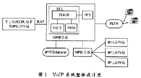 通過對(duì)國內(nèi)外VoIP技術(shù)的研究,要面向社會(huì)推廣價(jià)格低廉的IP電話業(yè)務(wù),普通用戶的電話終端成本,運(yùn)營商的設(shè)備、管理成本都是必須考慮的因素。因此,設(shè)計(jì)出了一個(gè)VoIP系統(tǒng)方案,如圖1所示。