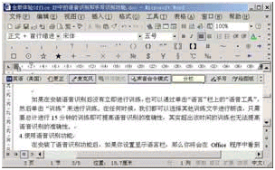 語音識別功能可以用于Microsoft Office的簡體中文、英語(美國)和日語版本,通過語音識別功能,我們可以將文字聽寫到任何 Office 程序中,也就是說只要你在任一Office程序中安裝了語音識別功能,以后就可以在所有Office程序中使用。除此以外,我們還可以用聲音選擇菜單項(xiàng)、工具欄項(xiàng)、對話框(僅用于美國英語)項(xiàng)和任務(wù)窗格(僅用于美國英語)項(xiàng)。