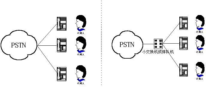 呼叫中心,早期是指一個(gè)由兩人或更多人組成的、在一個(gè)特定地方用專(zhuān)用設(shè)備處理電話業(yè)務(wù)的小組。這些人就是通常所說(shuō)的呼叫中心代理(人)。一個(gè)呼叫中心可以只提供信息接收服務(wù),或者只提供信息發(fā)送服務(wù),或者是一個(gè)混合式呼叫中心,其呼叫中心代理會(huì)負(fù)責(zé)所有這兩項(xiàng)工作。從物理設(shè)備構(gòu)成來(lái)看,第一代呼叫中心可用下圖(1)、(2)表示。
