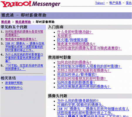 選擇工具->開(kāi)啟我的攝像頭后,就會(huì)彈出“我的即時(shí)影像”窗口(圖4),如果你的攝像頭安裝連接正常,可以馬上從這個(gè)窗口中看到你的影像;如果你的攝像頭正常,但在窗口中卻沒(méi)有看到影像,你可以在聯(lián)網(wǎng)的情況下選擇當(dāng)前窗口中的幫助->即時(shí)影像幫助進(jìn)入相關(guān)網(wǎng)頁(yè)(圖5)對(duì)你的攝像頭進(jìn)行雅虎通的兼容性測(cè)試,或者尋求更為詳細(xì)的幫助。