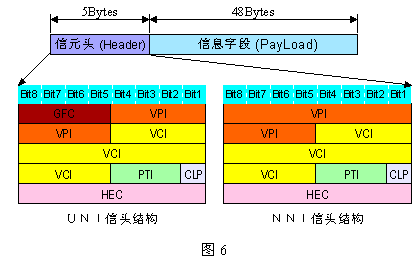 ATM信元實(shí)際上就是分組,為區(qū)分X.25分組(Packet)改稱為信元(Cell)。ATM信元具有固定的長度,總長為53字節(jié)。其中前5個(gè)字節(jié)為信頭(Header),包含各種控制信息,包括信元目的(邏輯)地址、糾錯(cuò)碼、業(yè)務(wù)控制和維護(hù)信息等;后面48字節(jié)為信息字段(Payload),又稱凈荷,其中包含了業(yè)務(wù)的數(shù)據(jù),它們將被透明地傳輸。信元結(jié)構(gòu)如下圖6所示。在UNI接口和NNI接口上ATM的信元頭結(jié)構(gòu)是不同的。