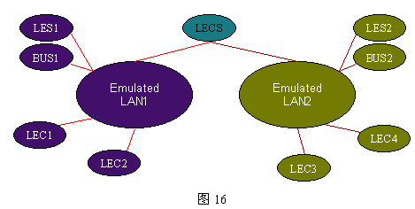 每個ELAN(Emulated LAN)由一組LANE客戶(LEC)和LANE服務(wù)構(gòu)成。LEC還可以是作為ATM主機(jī)代理的網(wǎng)橋和路由器。LE服務(wù)由三個不同的功能實(shí)體構(gòu)成:LAN仿真配置服務(wù)器(LECS)、LAN服務(wù)器(LES)和BUS,這三個服務(wù)實(shí)體可以各自存在,但通常位于同一設(shè)備,例如:LES可以位于ATM交換機(jī)、路由器、網(wǎng)橋和工作站。ATM LANE的構(gòu)成及相互關(guān)系如下圖16所示: