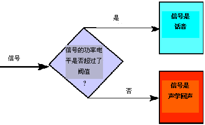聲學(xué)回聲的一般頻譜特征類似于語音的頻譜特征。類似地,聲學(xué)回聲路徑中的非線性特征會引起回聲和原始語音音節(jié)之間的不一致。因此,有效語音和對應(yīng)的聲學(xué)回聲之間的電平差異(振幅差異)提供了相應(yīng)的信息,使用該類信息,可將聲學(xué)回聲從主流語音中分離出來。在圖4中,給出了識別某一信號是有效信號還是聲學(xué)回聲信號所采用的邏輯方法的概念視圖。